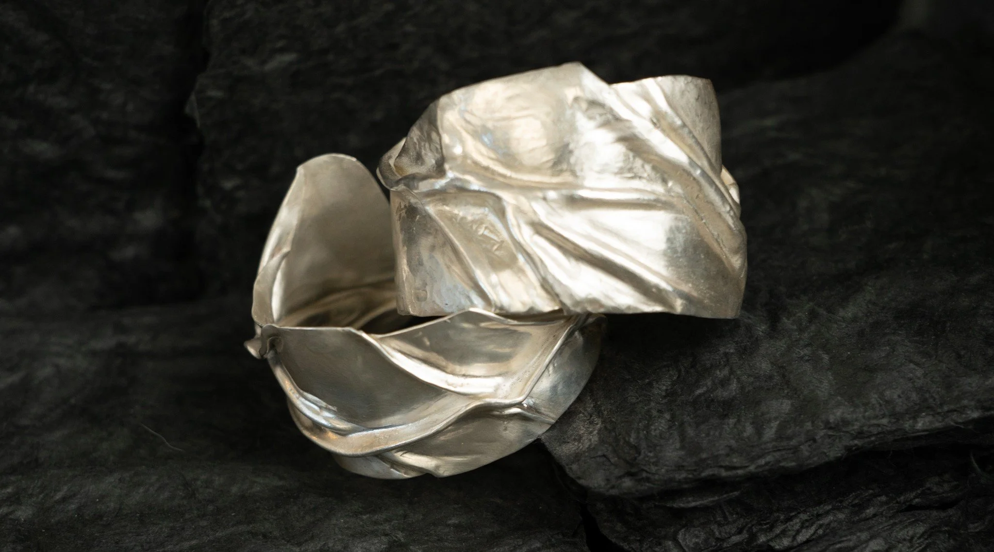 Simple folds become the language of the land. Fine silver is shaped into gentle raises and planes that recall mountain ridges, shifting horizons, and the subtle structure beneath. These pieces hold strength and stillness, reflecting the way the landscape reveals itself gradually over time.